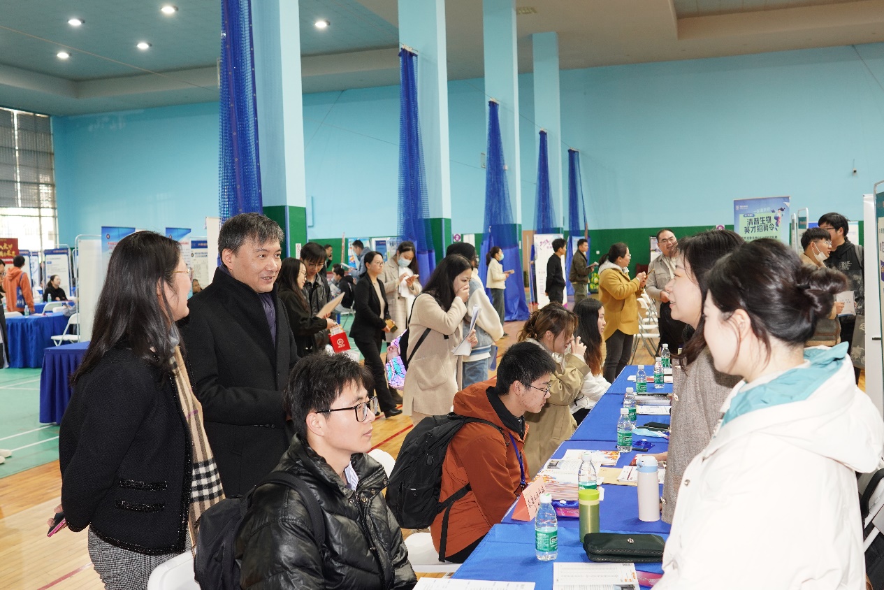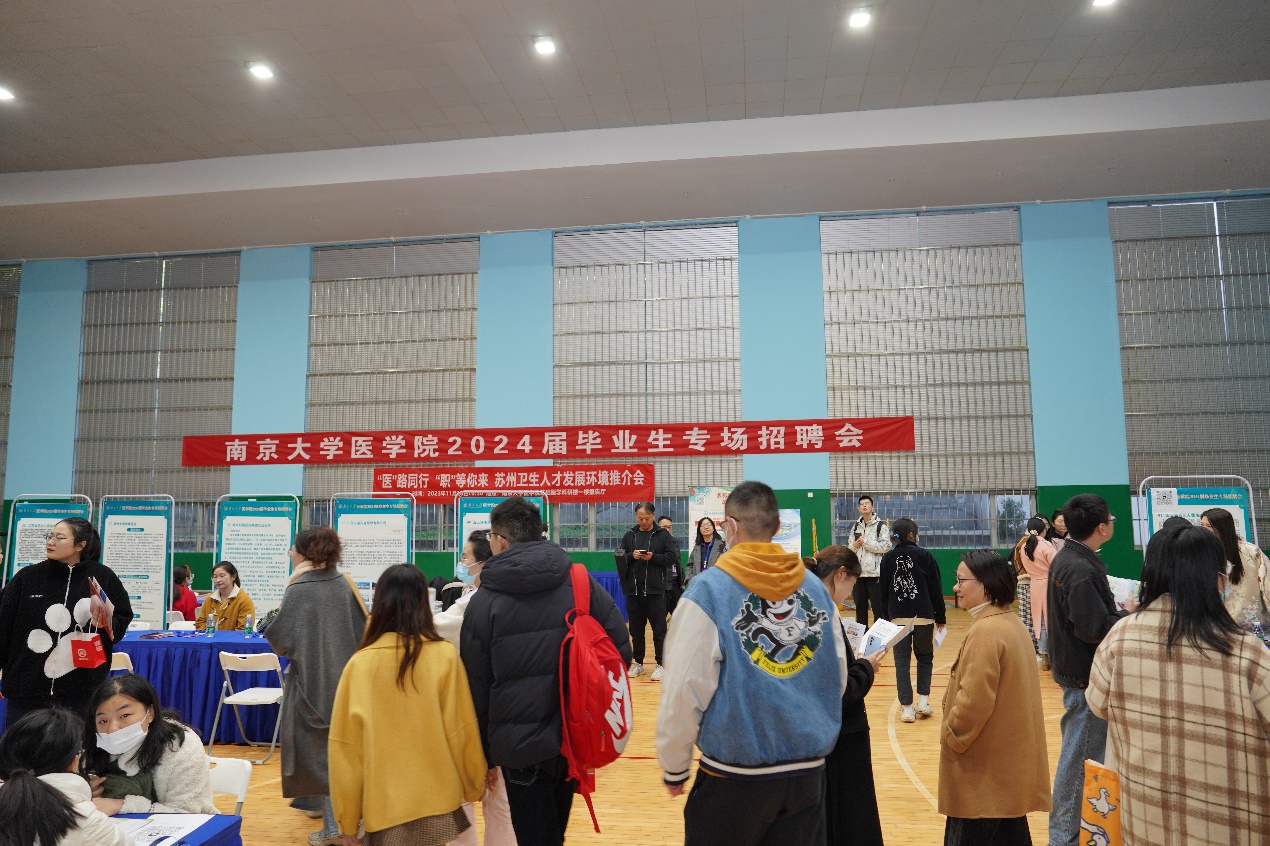 18日上午,太阳成城集团tyc234cc古天乐2024届毕业生专场招聘会在鼓楼校区体育馆举办。同时,苏州市卫健委带队组织相关用人单位在公司举办了“苏州卫生人才发展环境推介会”。本次专场招聘会共有50余家来自全国各地的医药行业单位参会,用人单位类型涵盖了医院、高校、医药企业等。招聘会现场气氛热烈,参会毕业生达300人次,许多毕业生在展位前驻足咨询,与用人单位代表深入交流。公司党政领导高度重视,党委书记沈苏南、党委副书记王阿妮也来到招聘会现场,与各用人单位、毕业生亲切交流。