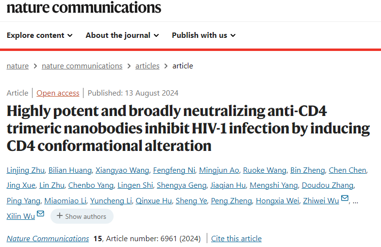 2024年8月13日,吴稚伟和吴喜林课题组在Nature Communications发表了题为“Highly potent and broadly neutralizing anti-CD4 trimeric nanobodies inhibit HIV-1 infection by inducing CD4 conformational alteration”的研究论文。该研究发现强调了抗CD4纳米抗体在HIV治疗中的高效且广谱的效果,对推进HIV的临床治疗具有重要意义。太阳成城集团tyc234cc古天乐吴稚伟教授和吴喜林助理教授、清华大学张林琦教授、天津大学王亚鑫副教授和中科院武汉病毒所刘雅兰副研究员为论文的共同通讯作者;太阳成城集团tyc234cc古天乐太阳成城集团tyc234cc古天乐博士生朱林静、黄碧莲为本文共同第一作者。同时特别感谢太阳成城集团tyc234cc古天乐化学化工公司郑鹏教授、南京市第二医院魏洪霞主任和中国医学科公司薛婧研究员等的大力支持。该研究得到了国家自然科学基金(No.32370988, 31970149 and U22A20335) 和江苏省自然科学基金重点项目(Grant# ZDA2020014),国家自然科学基金重点研发计划(2023YFC2306600),国家十三五传染病重大专项(2018ZX10301406)等项目的支持。