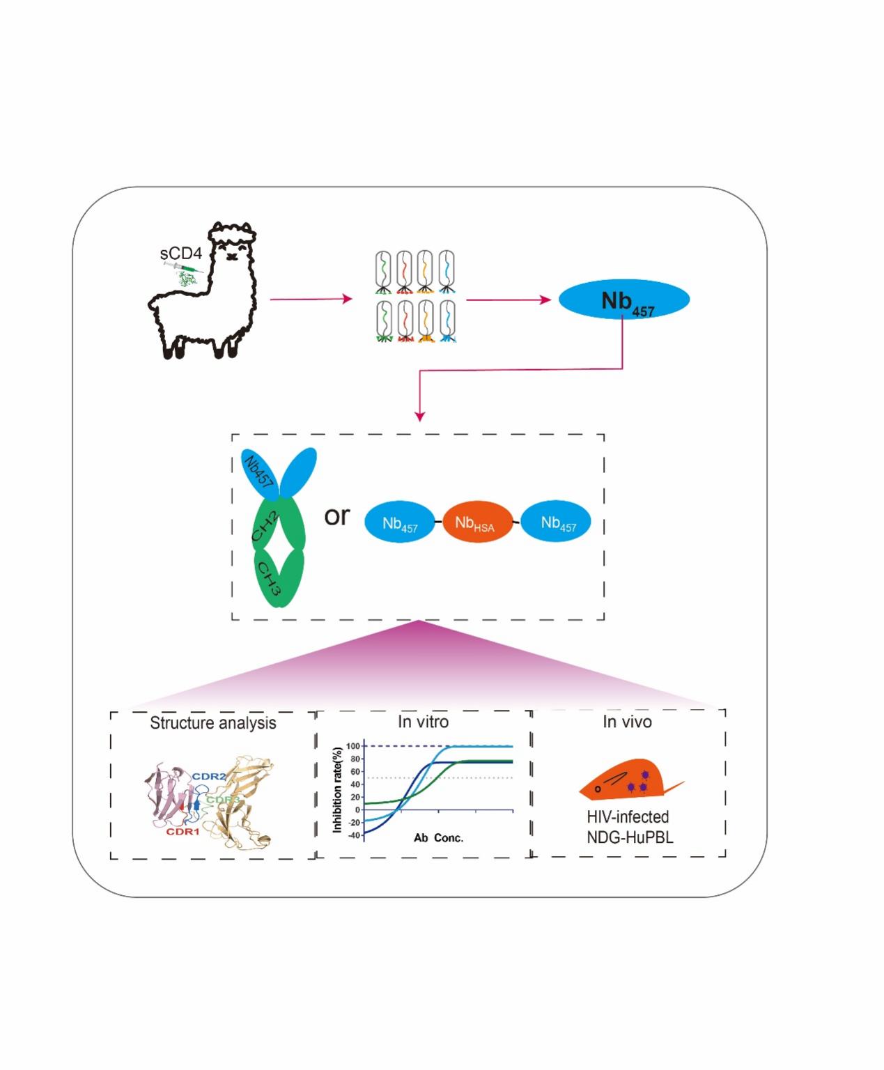 为了深入解析纳米抗体的作用机制,研究团队还进行了晶体结构解析。他们观察到Nb457通过与CD4结合,诱导了CD4的D1结构域构象改变,从而有效地阻碍了HIV-1的gp120与CD4细胞的结合。同时,他们发现Nb457的表位位于MHC-II结合位点的另一侧,避免了对MHC-II结合的干扰,进一步实验结果也验证了这一点,表明Nb457具有良好的安全性。