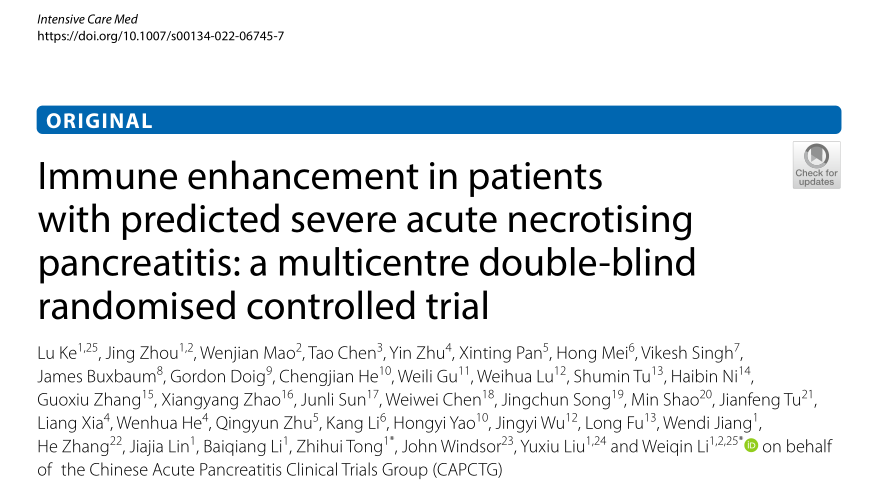 上述研究成果“Immune enhancement in patients with predicted severe acute necrotising pancreatitis: a multicentre double-blind randomised controlled trial”于2022年6月17日发表于重症TOP期刊《Intensive Care Medicine》,太阳成城集团tyc234cc古天乐附属金陵医院为论文的唯一通讯单位,柯路副教授、周晶博士、毛文健博士研究生为共同第一作者,童智慧副教授、李维勤教授为共同通讯作者。