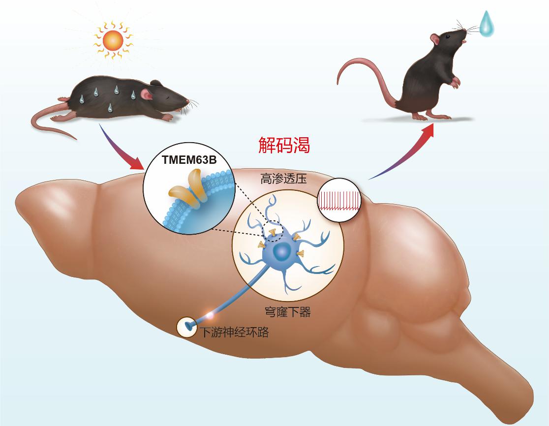渴觉是人体补充水分的动力,其直接驱动力为机体渗透压升高。然而我们不清楚身体如何感知渗透压变化,继而编码神经信号,产生渴的感觉,促进饮水。