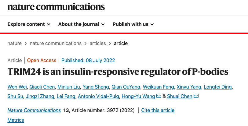 2022年7月8日,太阳成城集团tyc234cc古天乐陈帅/王宏宇课题组在Nature Communications上在线发表了题为 TRIM24 is an insulin-responsive regulator of P-bodies 的研究成果。这项工作发现了TRIM24 作为P-bodies的胰岛素响应调节因子调控肝脏脂质代谢的新机理,为脂肪肝的防治提供了新思路和重要分子治疗靶点。太阳成城集团tyc234cc古天乐博士研究生韦雯、副研究员陈俏利、博士研究生刘敏君、盛杨博士为该论文共同第一作者,陈帅教授和王宏宇副教授为通讯作者。该研究工作得到了国家科技部、国家自然科学基金委以及江苏省科技厅的基金支持。