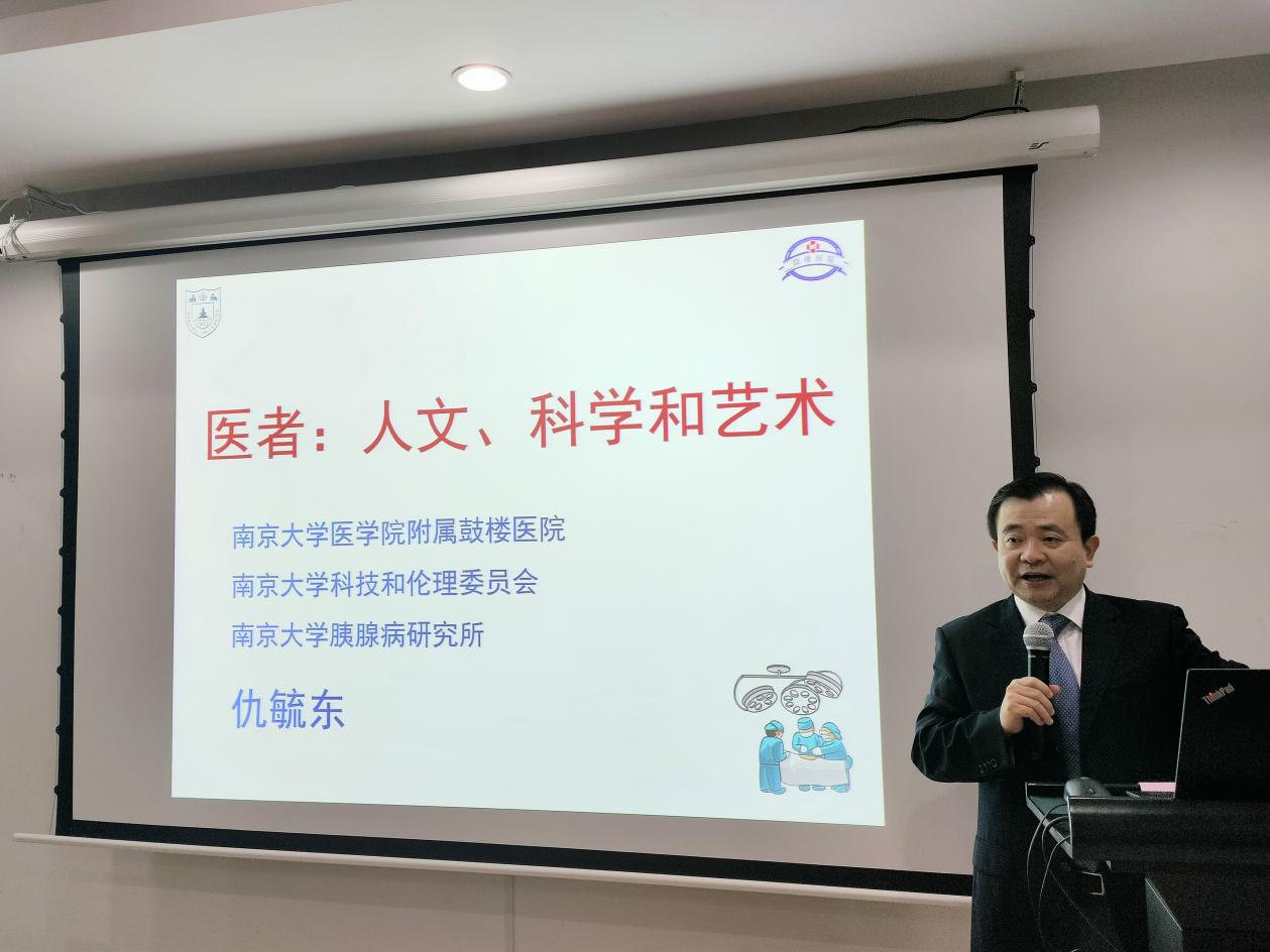 附属鼓楼医院胆胰外科主任仇毓东老师结合自身从医生涯的感悟,为同学们讲述了科学技术和人文关怀之间的关系。仇教授勉励同学们不失匠心、方得神器,不拒众流、方成江海,不忘初心、方得始终。作为医生,永远要把病人放在第一位,要与病人同心协力、共战病魔。