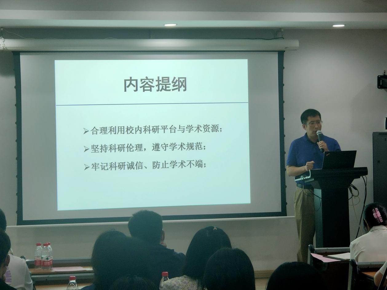 王宏伟副经理和院办应锋主任分别为同学们介绍了科研体系、实验平台、科研规范以及实验室安全相关内容。王宏伟副经理希望同学们要合理利用校内科研平台与学术资源;坚持科研伦理,遵守学术规范;牢记科研诚信、防止学术不端,做诚实守信的南大学子。应锋主任向同学们讲述了高校实验室安全的重要性。“学途有规,安全先行”,应锋主任提醒同学们在日常实验室使用过程中,要注意个人防护、排除安全隐患、养成良好的实验习惯。